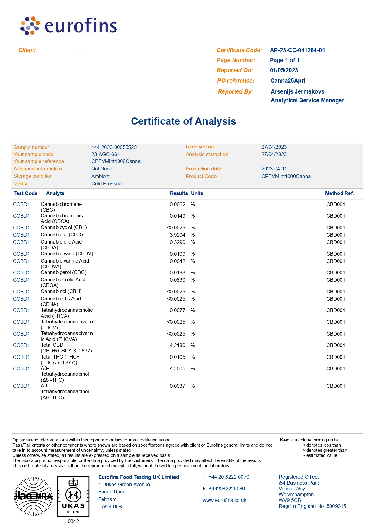 Ingredients: 1000mg Total Active Cold Pressed Broad Spectrum CBD, Olive Oil, Peppermint Natural Flavouring.