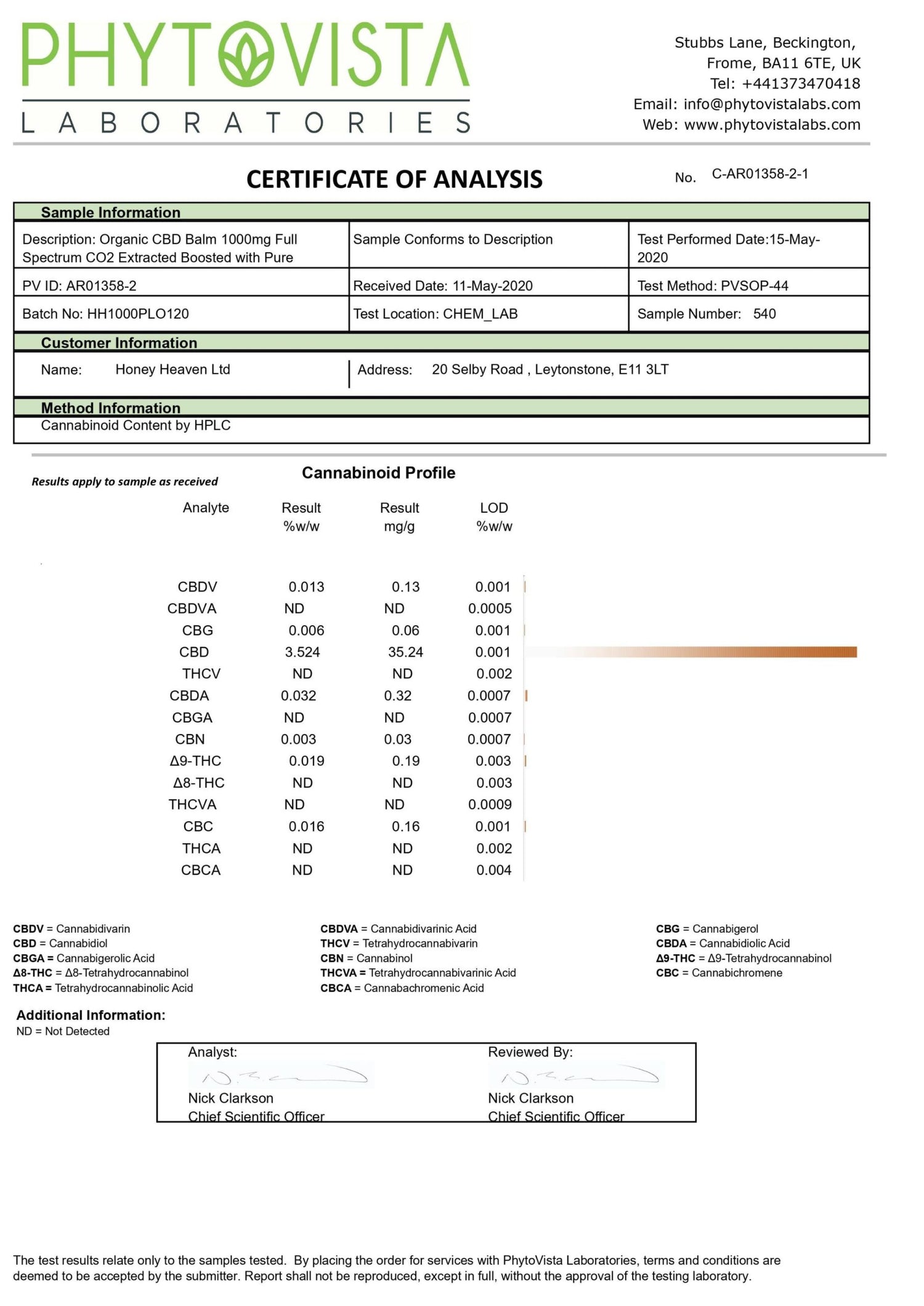 Afterwards, there will be an interaction of the active ingredients in Honey Heaven's Supercritical CO2 Extracted Organic Full Spectrum CBD Balm with the nearby endocannabinoid receptors to cause the relief to a wide variety of ailments, pains or conditions.