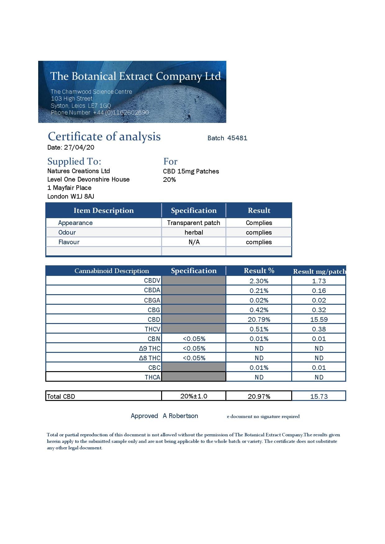 Ingredients: Acrylates copolymer, Aqua (Water), Cannabis sativa L. extract providing 15mg CBD per patch, Polysorbate 20, Phenoxyethanol, Vanillyl butyl ether.