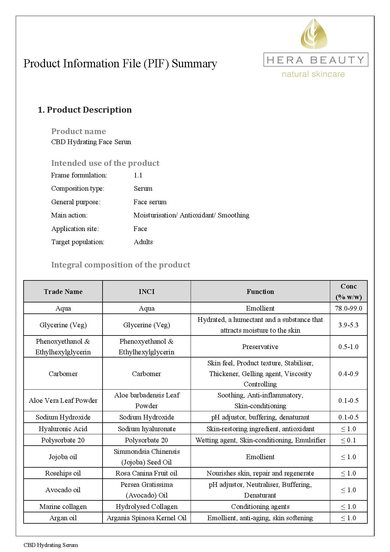 Ingredients: Aqua, Glycerine (Veg), Phenoxyethanol & Ethylhexylglycerin, Carbomer, Aloe Barbadensis Leaf Powder, Sodium Hydroxide, Sodium Hyaluronate, Polysorbate 20, Simmondsia Chinensis (Jojoba) Seed Oil, Rosa Canina Fruit oil, Persea Gratissima (Avocado) Oil, Hydrolysed Seaweed Collagen, Argania Spinosa Kernel Oil, Camellia Sinensis Leaf, Passiflora Incarnata (Passionfruit) Seed Oil, Arnica Montana Flower Extract, Pyrus Malus (Apple) Fruit Extract, Citrullus Lanatus Seed Oil, A-Tocopherol, Retinyl Palmitate, Cannabidiol 30mg, Citrus Sinensis (Sweet Orange Essential Oil)