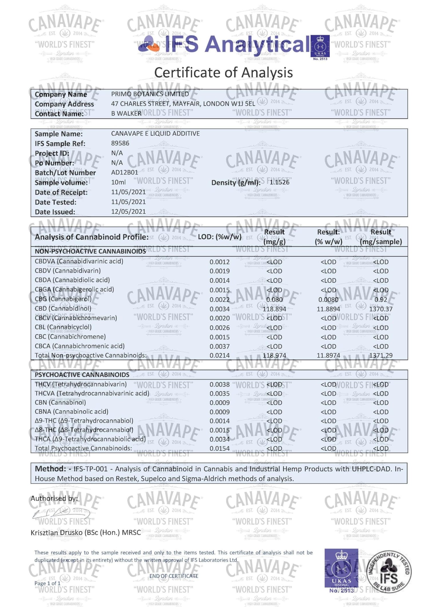 Formulated for use as a CBD additive 10ml UV proof thin tipped plastic bottle Ultra high strength: 1200mg of pure CBD per bottle Safely manufactured in an ISO-7 certified laboratory Laboratory tested for purity with certificate of analysis 0% THC and free from residues, waxes and impurities. Developed using pharmaceutical grade cannabinoids.